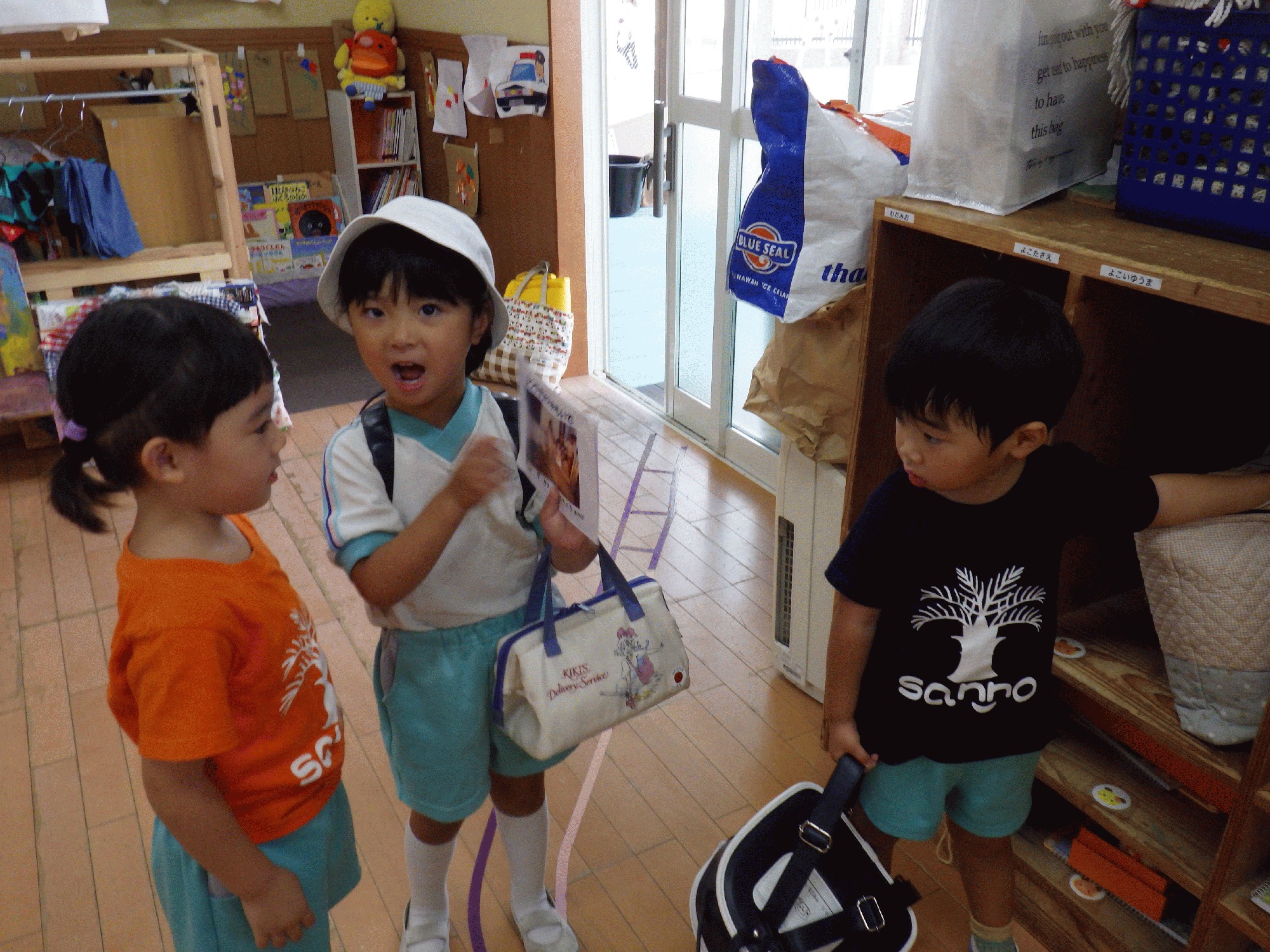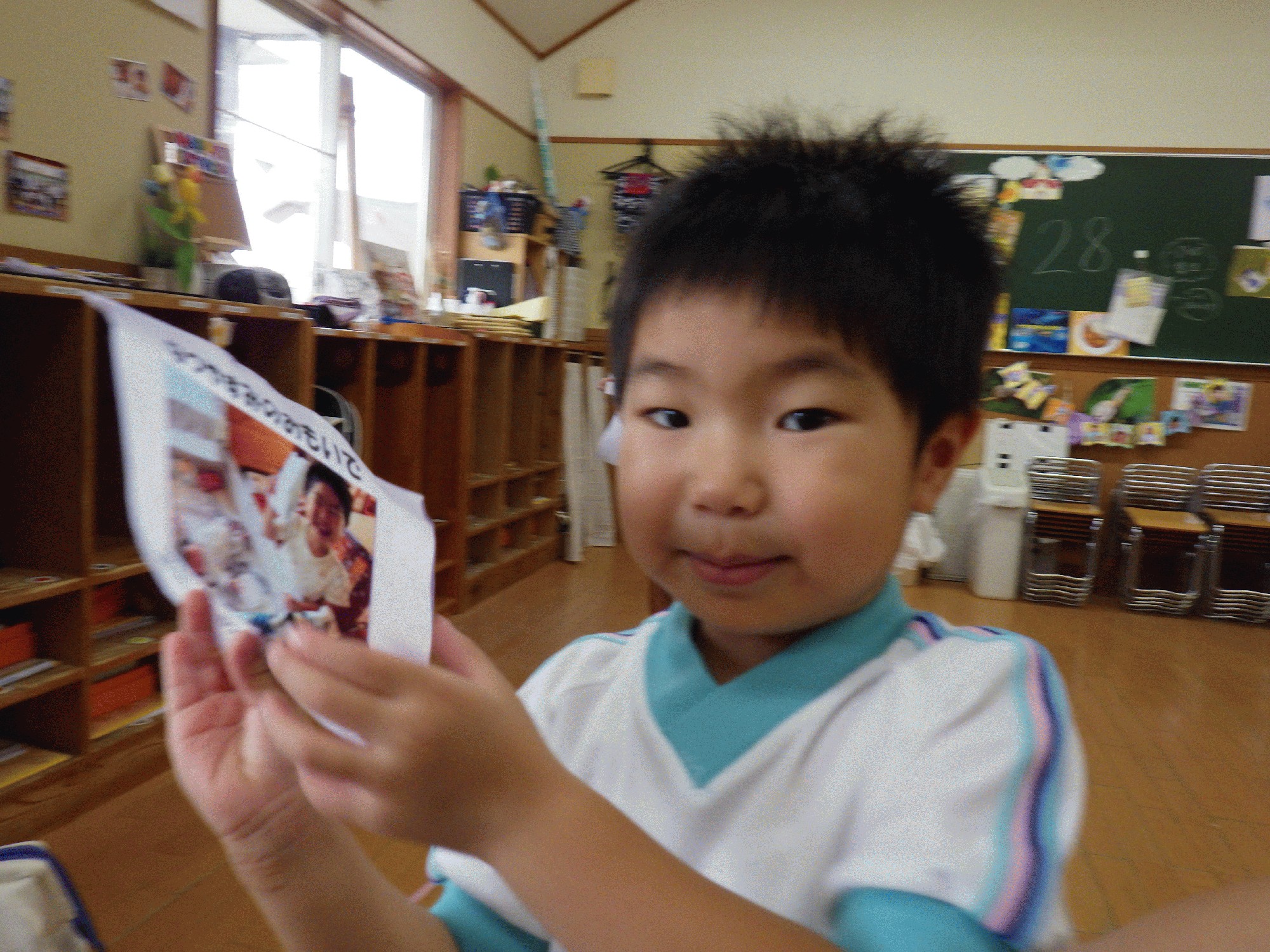 朝登園してくると、夏休みの思い出の紙を持って