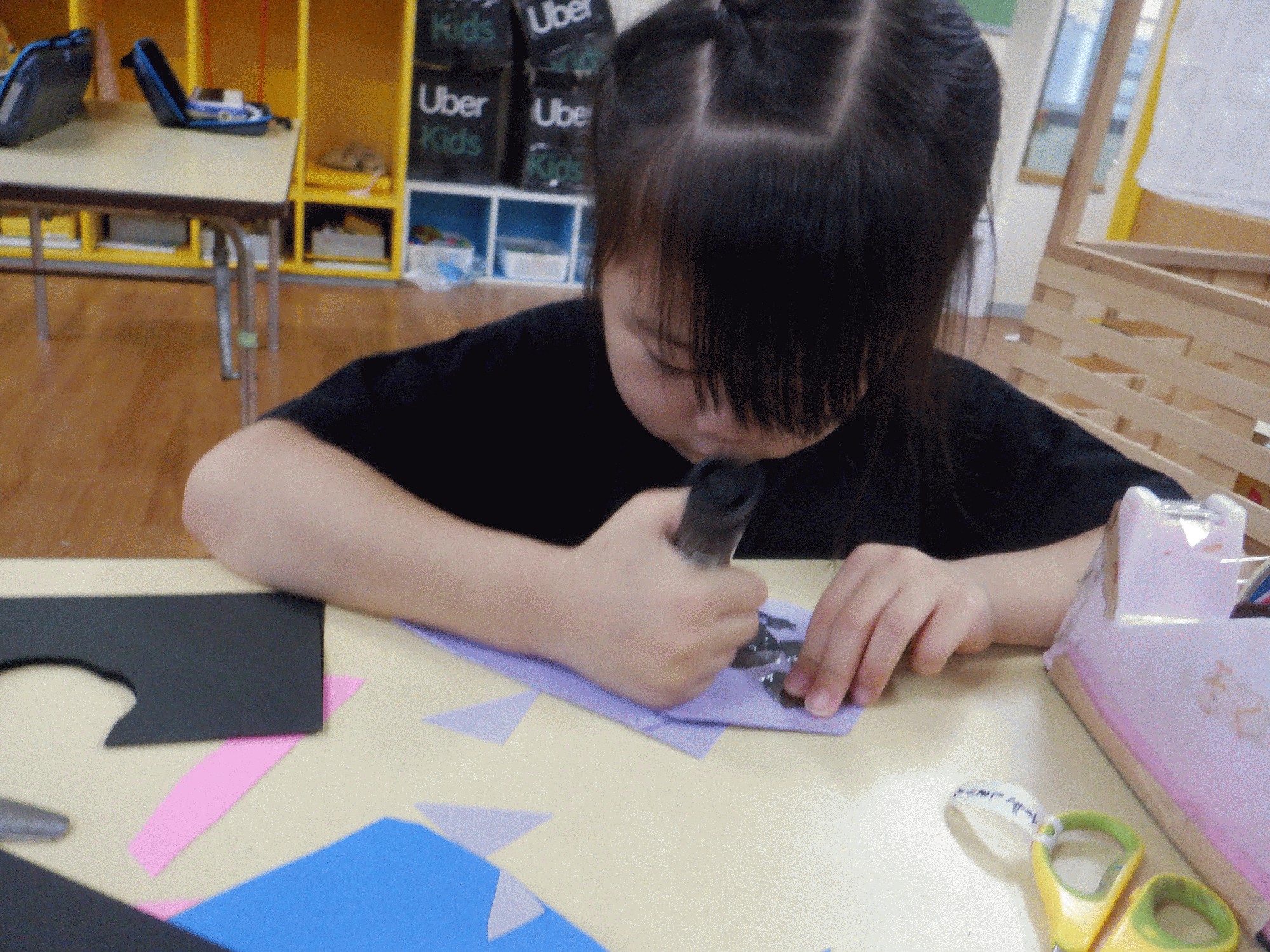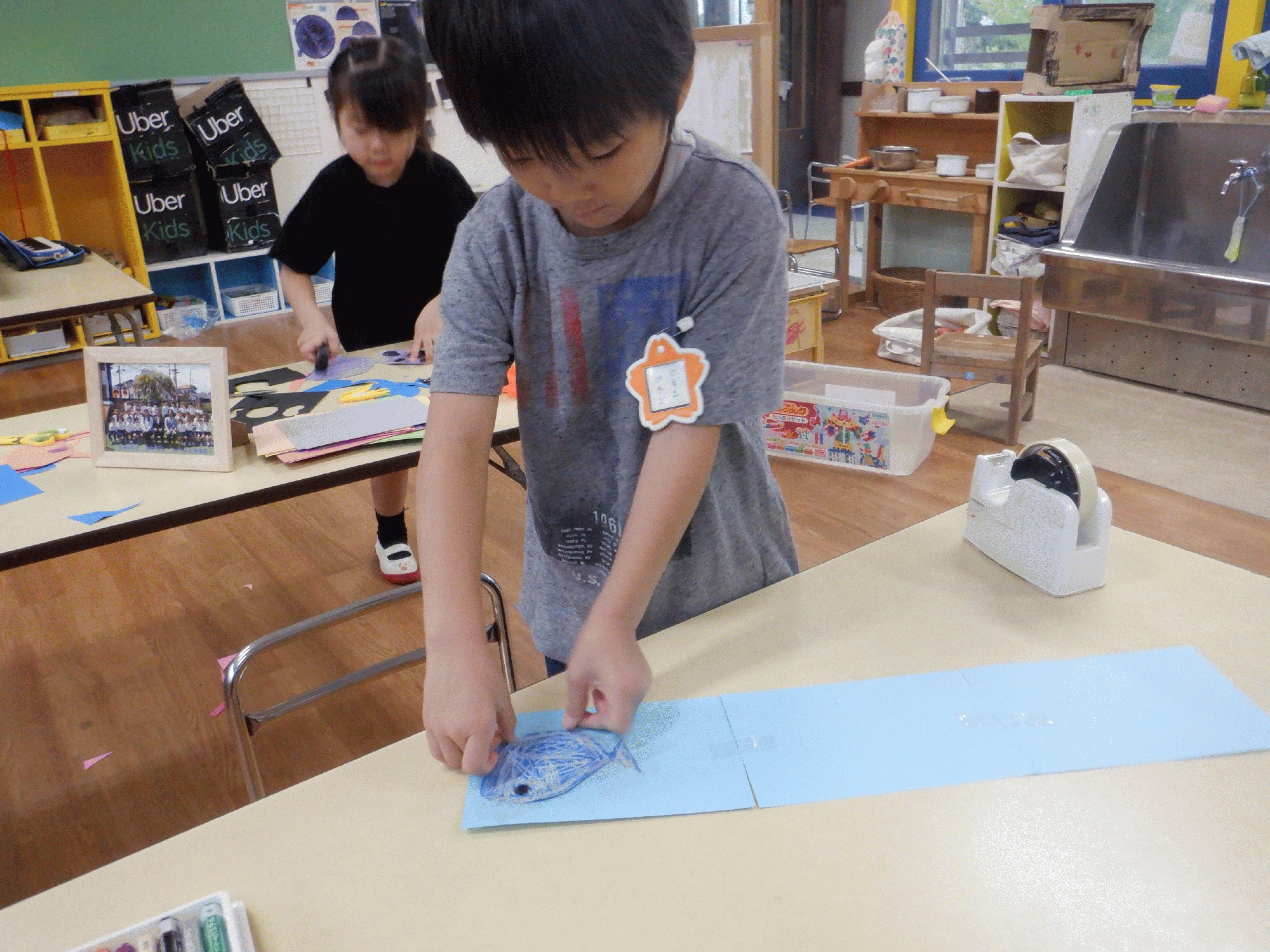 今日来たふじ組の子ども達は6人!!「まだみんな来ないね〜」「他のクラスは何人来てるのかな?!」と何だか普段の日常と違う幼稚園にソワソワしている様子でした。午前中は部屋で自由に遊び、絵本に載っている魚を見ながら画用紙で水族館を作ったり、切った画用紙から何ができるか想像しながら作品を作ったりしました✂️