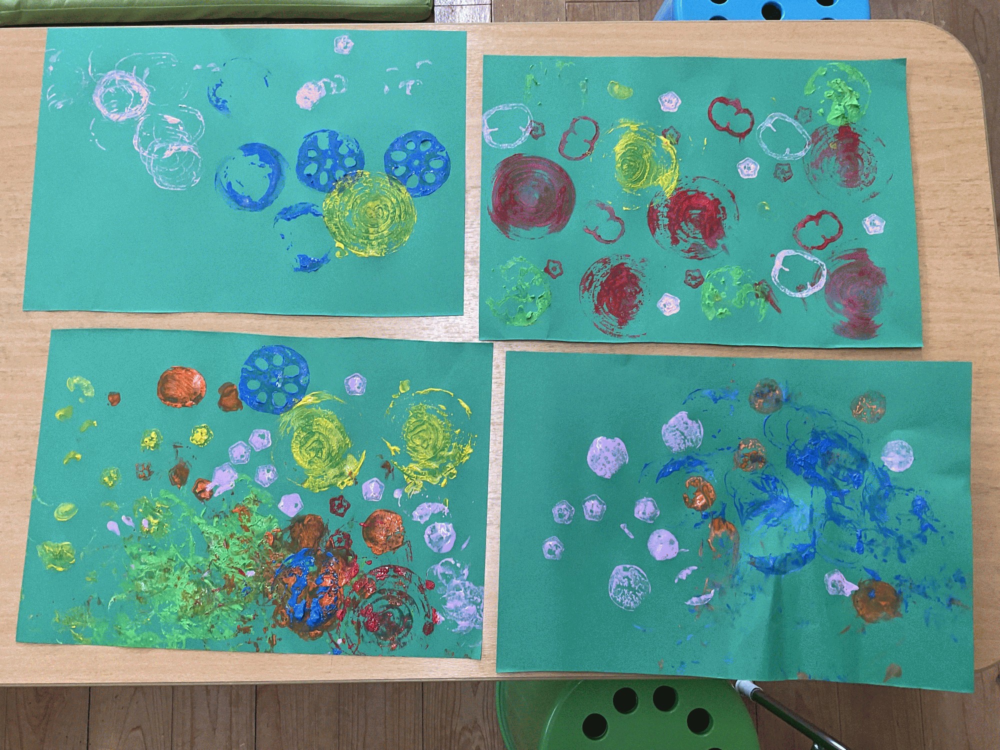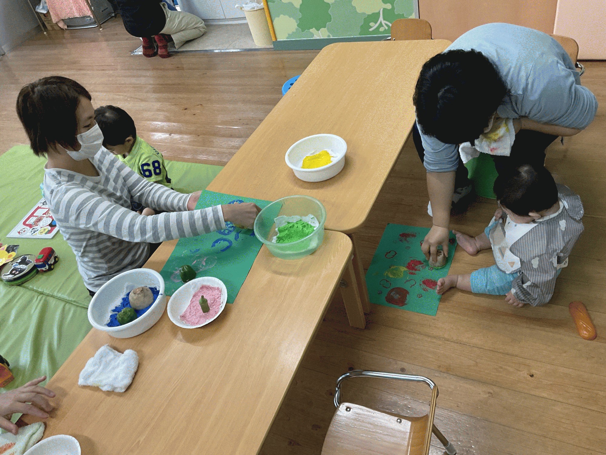 シールを貼ったり歌あそびを楽しんだあとは、野菜スタンプで遊びました。レンコン・ピーマン・キュウリ・オクラ…実際に見たり触ったりしてから、画用紙にぺったんとスタンプ。押すだけでなく、画用紙の上で転がしたり・直に絵の具に触ったり、まだ小さいお友だちは ママが押すのをじーっと見ていました。素敵な作品が、たくさん出来ました!