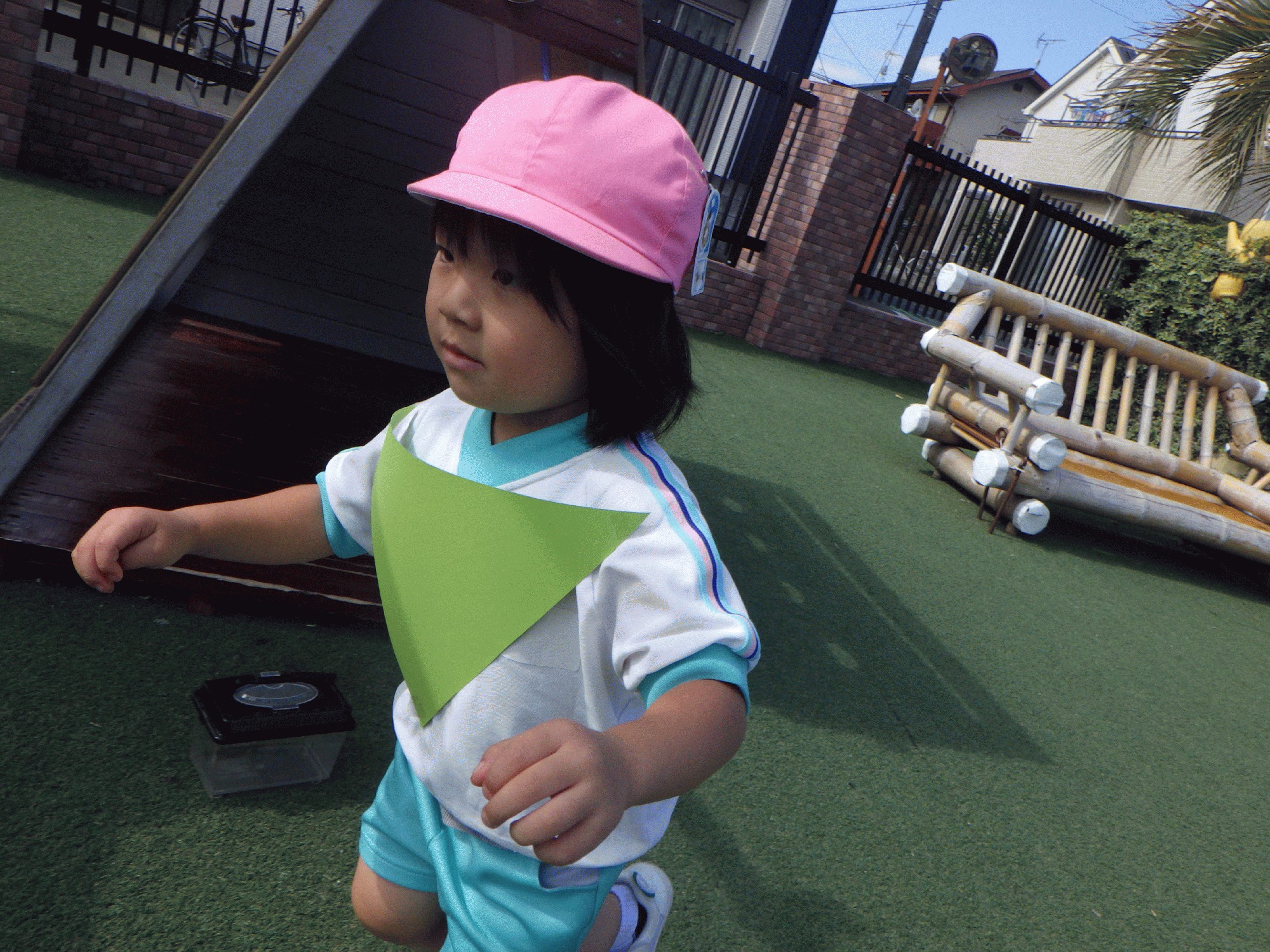 昨日は黄緑色の画用紙をお腹に貼り付け、手を広げて芝生を走り回っている子が...