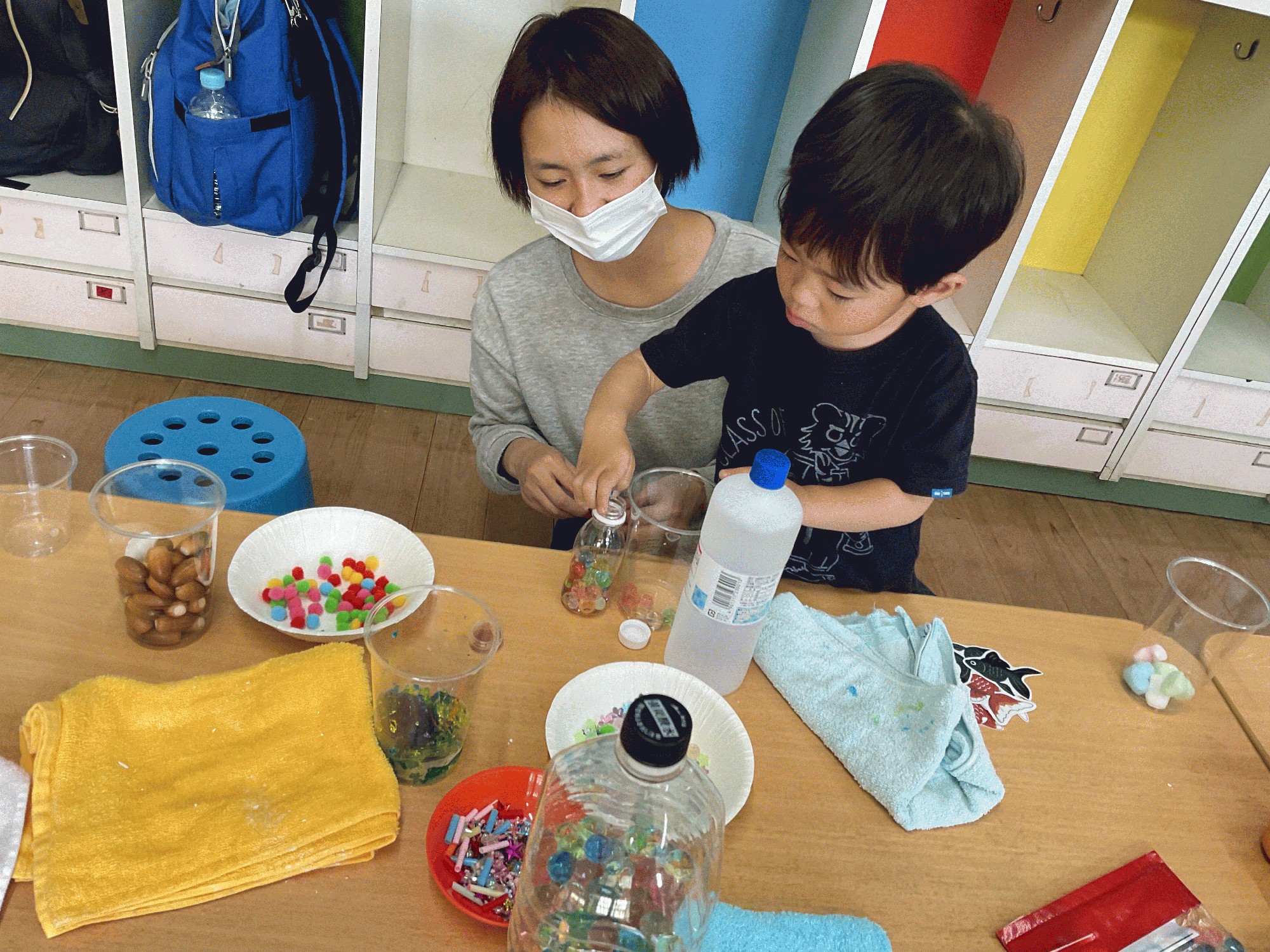 季節の歌あそびのあとは、出席カードにシールを貼っておもちゃをお片付け。それから、みんなで感触遊びをしました。パン粉や片栗粉・氷・寒天ゼリー…色々な感触を楽しんだり、ジッパーバッグや乳酸菌飲料の小さいボトルを使って、センサリーバッグ・ボトルを作りました。ビーズやストロー・ぷよぷよボールにふわふわのデコレーションボールなどなど、好きなものを入れて口をガムテープやビニールテープでしっかり閉じたら出来上がり!お家で楽しく遊んでくださいね。