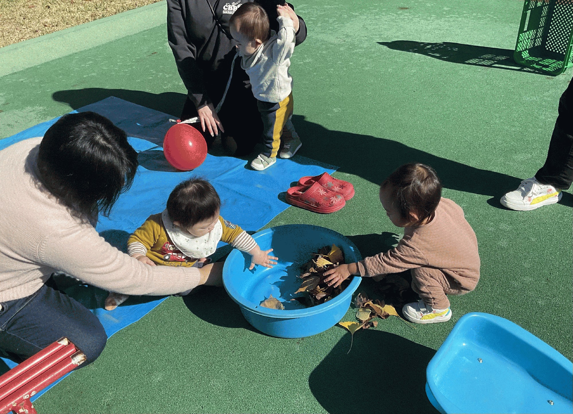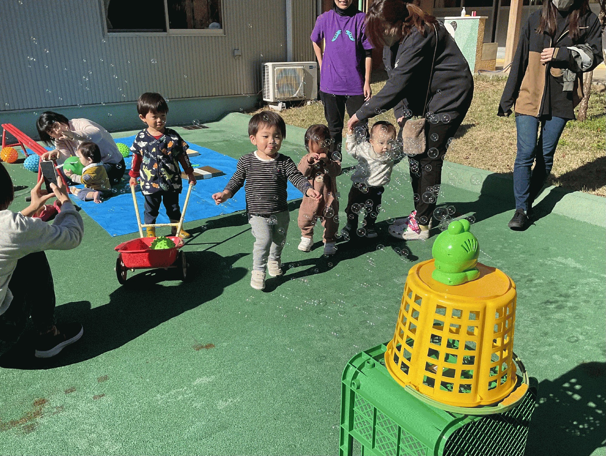 今日はお天気が良く暖かだったので、歌あそびの後は コスモスのお部屋の隣のゴムチップの所で、落ち葉遊びをしました。落ち葉に触ったり.掬ったりばら撒いてみたり…他にも鉄棒や平均台・小さい三輪車などを出しておいて、外遊びを楽しみました。特にカエルさんのしゃぼん玉機が大人気で、次々と出てくるシャボン玉を追いかけたり捕まえたり!キラキラ光りながら飛んでいくしゃぼん玉が、とても綺麗でした。