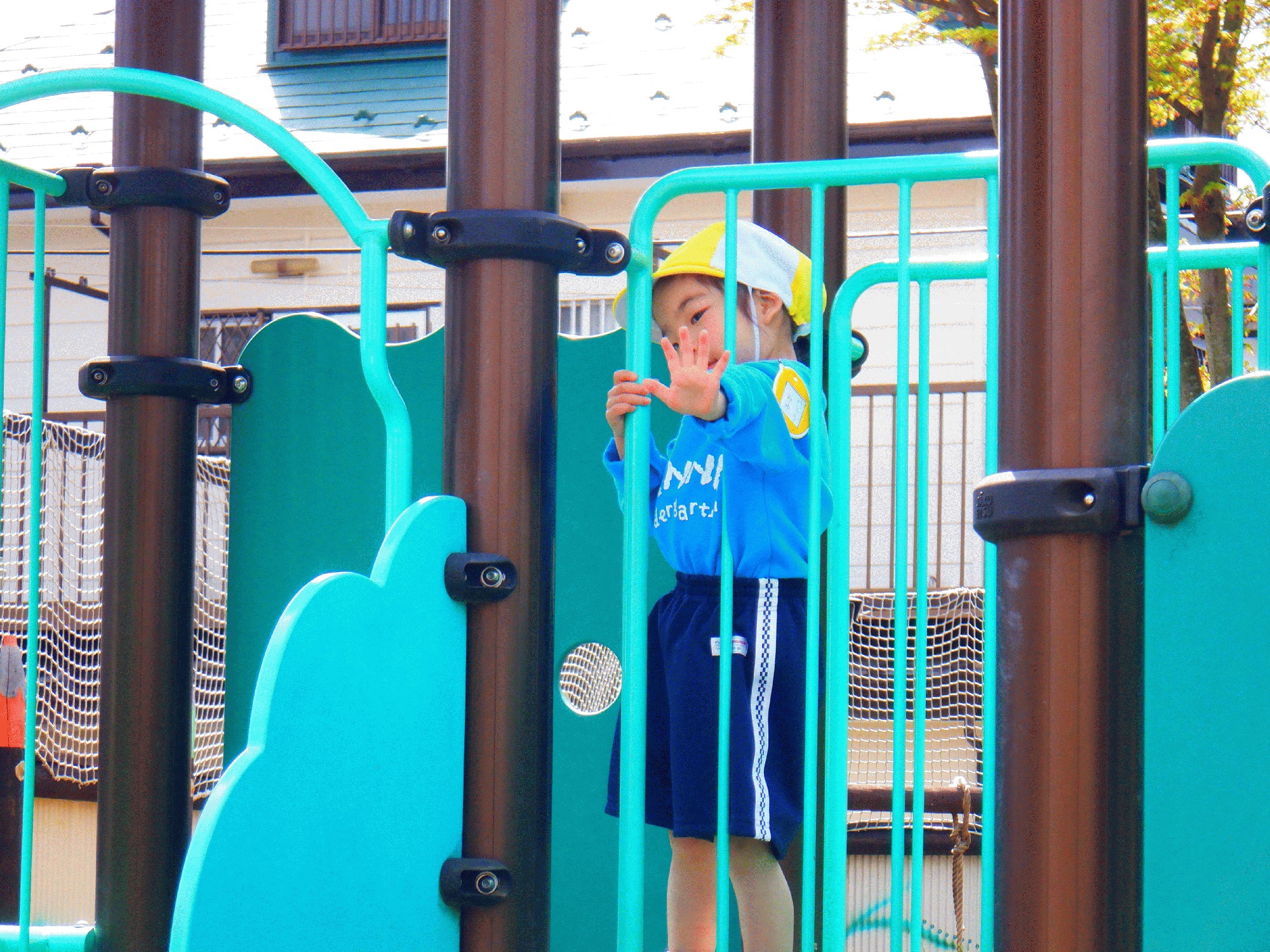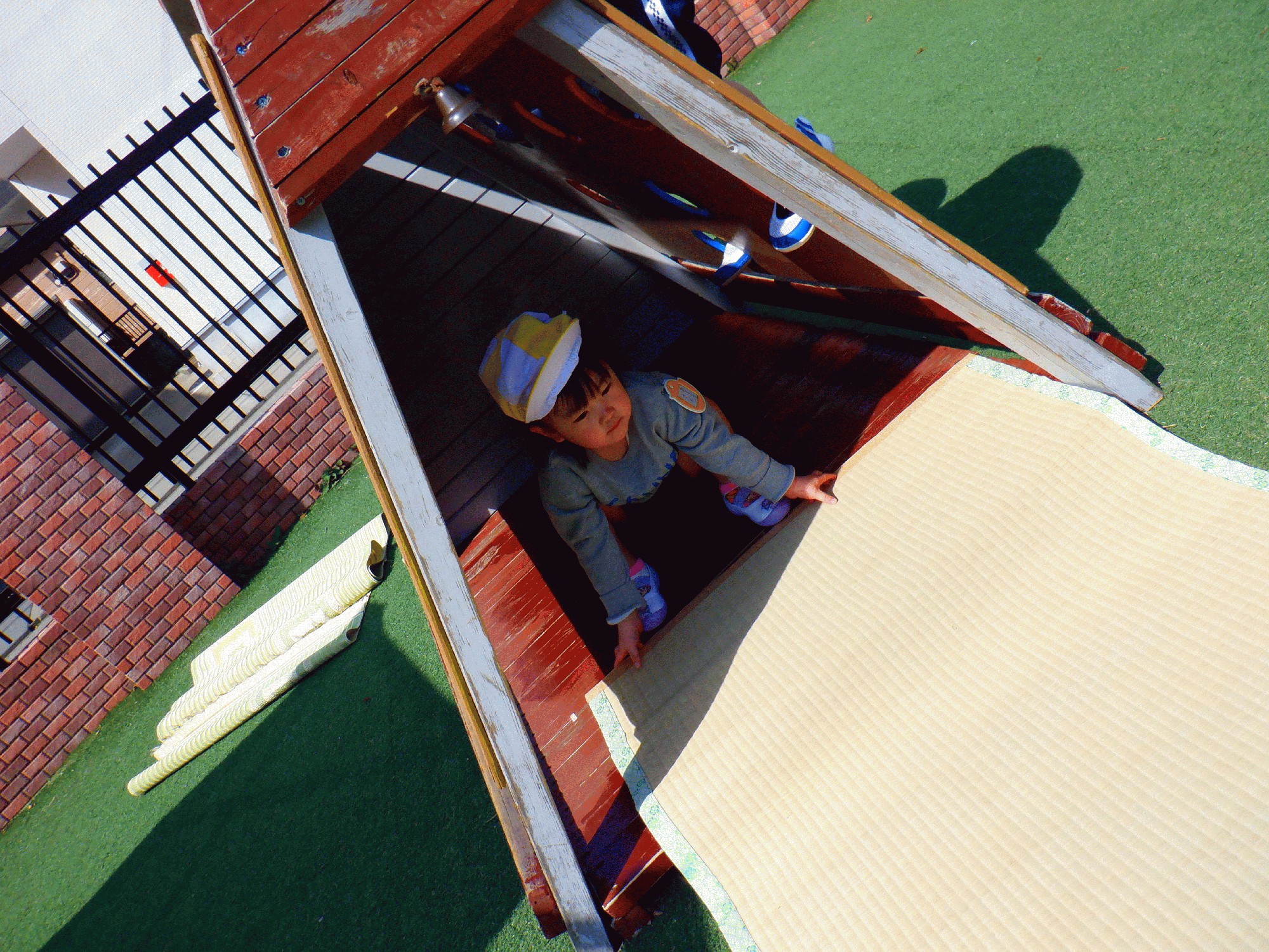 芝生でたくさん遊んだ後には園庭にもいき、非常滑り台についての話をしたり、うずら小屋を見てうずらを探したり、玩具の戻す所の確認をしたりしました!