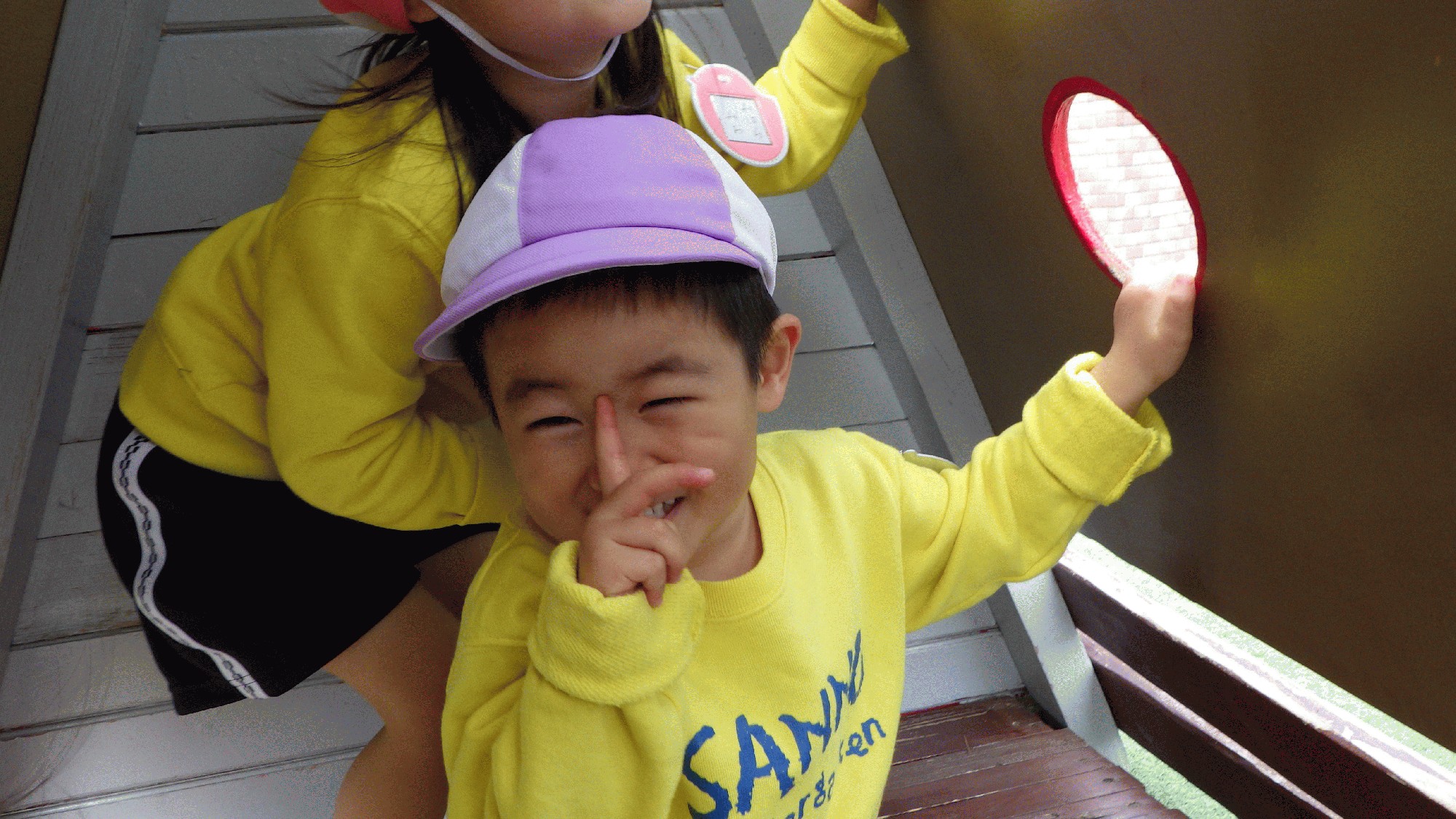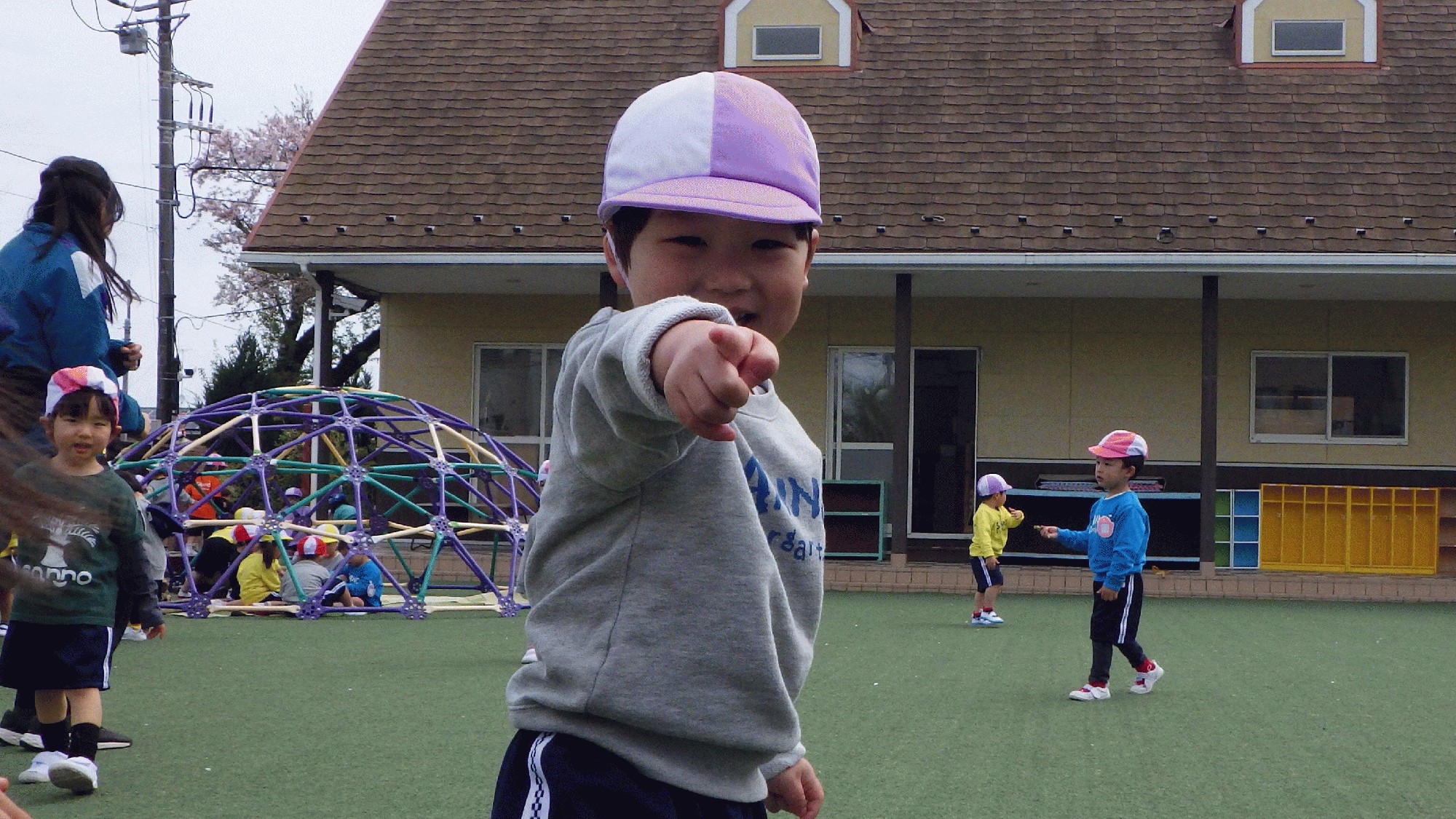 幼稚園での生活が始まって早くも1週間が経ちましたね!自分が付けているバッチと同じ色、形を見つけては「おんなじ〜^^」と見せ合いっこしたり、名前を覚えると「○○くん、かくれんぼしよう!」と誘って一緒に遊んだり、少しずつ交流が増えているように感じています♪今日は朝の遊ぶ時間までは晴れていたので芝生でいっぱい遊びました!かくれんぼでは、「みーつけた!」と嬉しそうに見つける姿があったり、全員が隠れる人になり「しー!」と身を潜め合ったり、、年少らしさがあるかくれんぼになり微笑ましかったです☺️💗