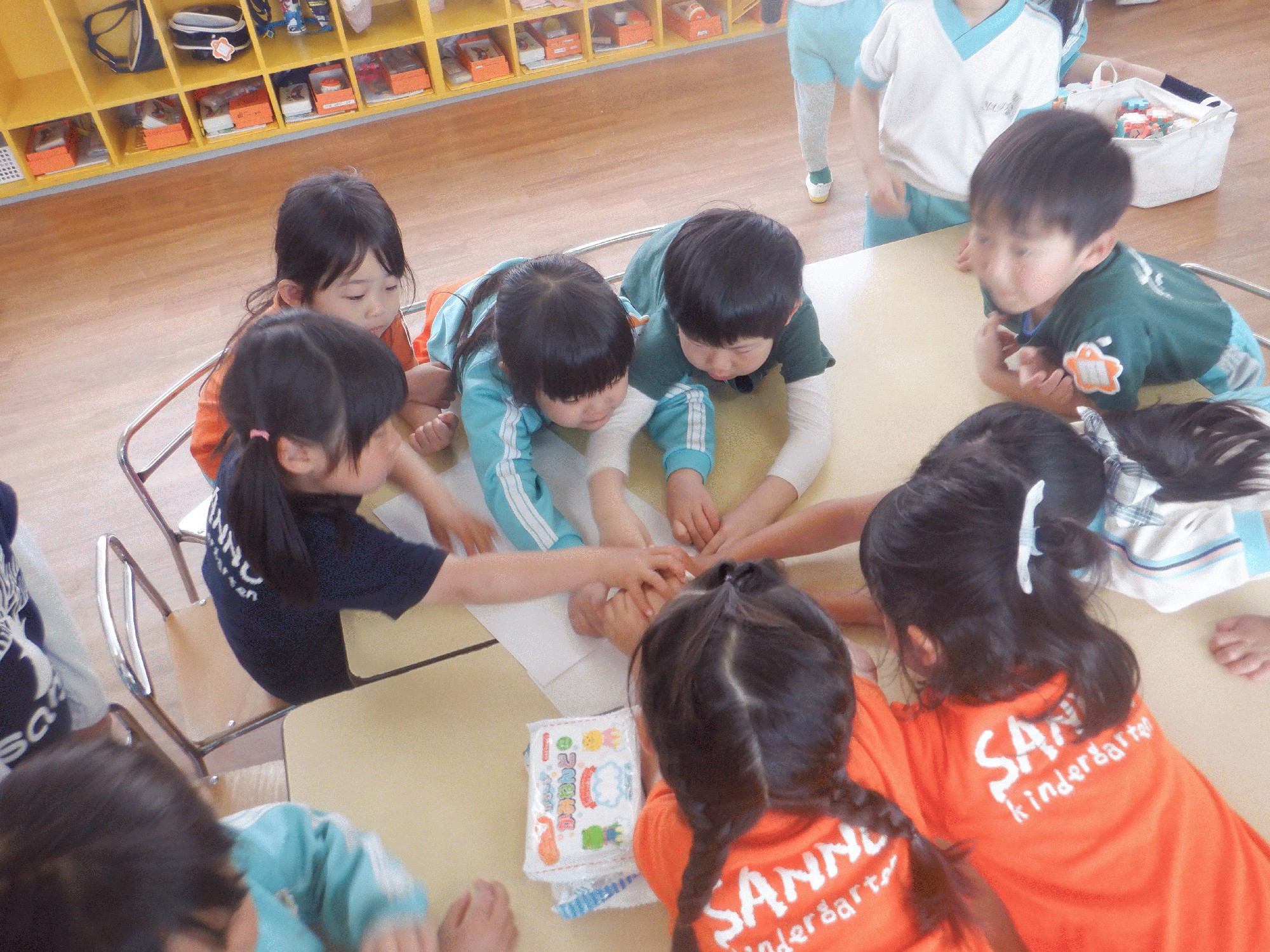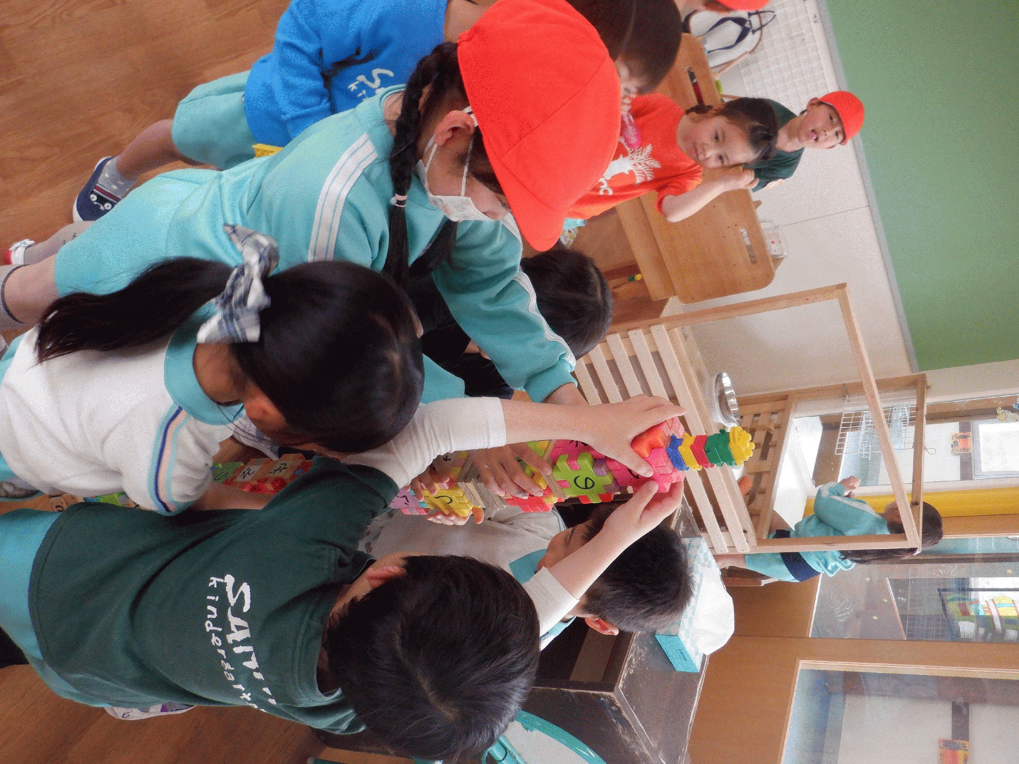 そして、三枚目の写真は、プチ流行している平仮名ブロックのタワー作り🗼倒れるか倒れないかハラハラドキドキ...!みんなで支え合う姿が見られています☺︎