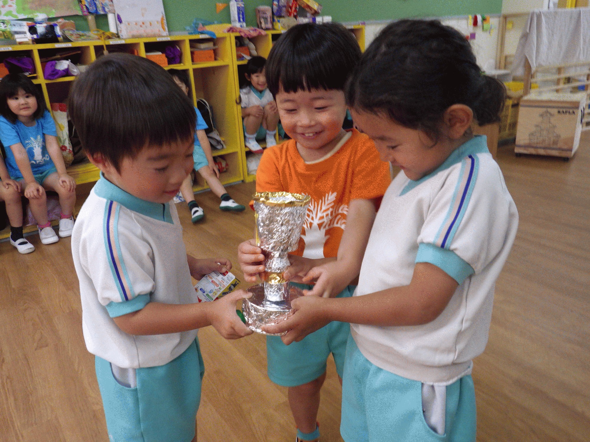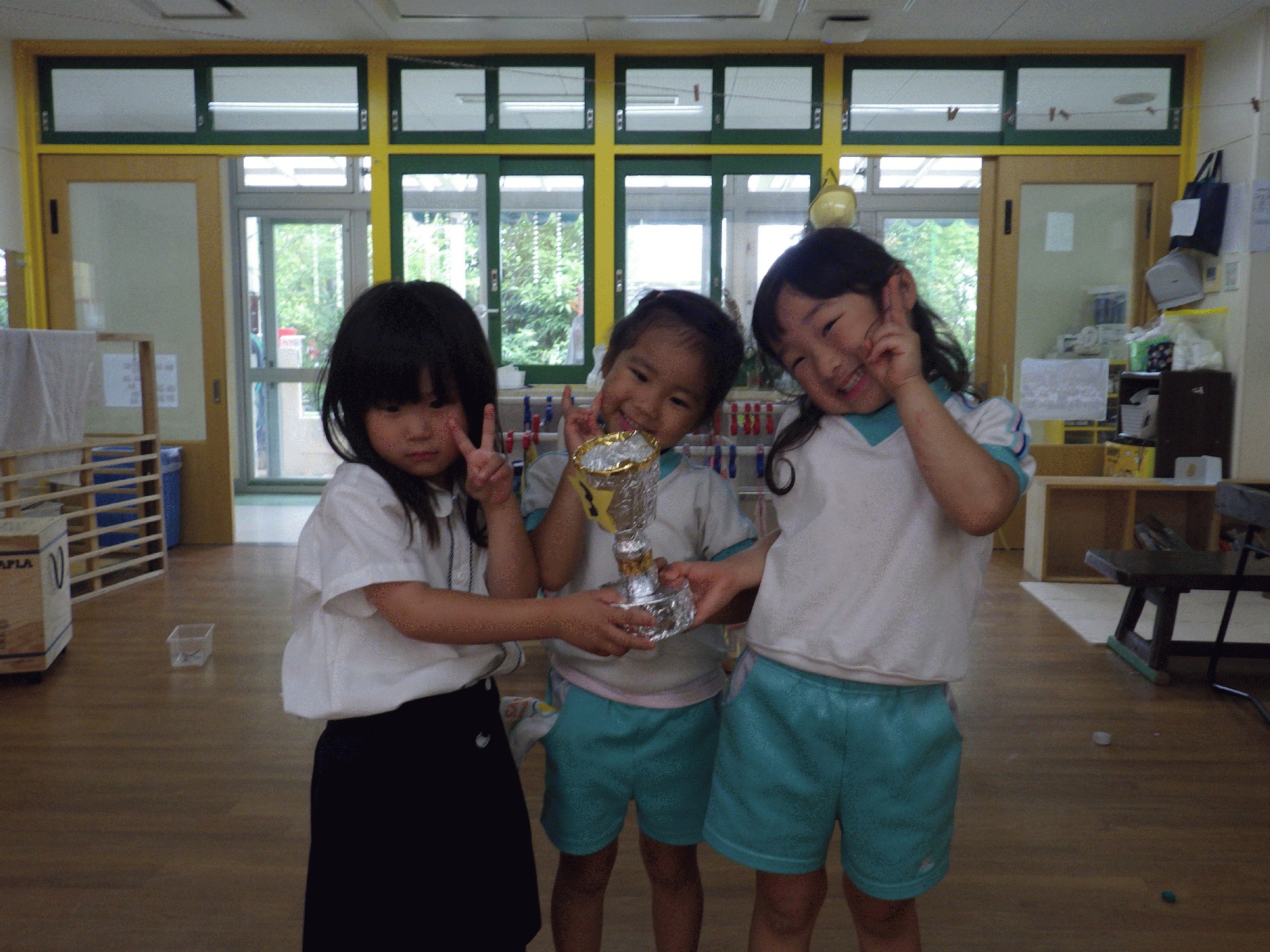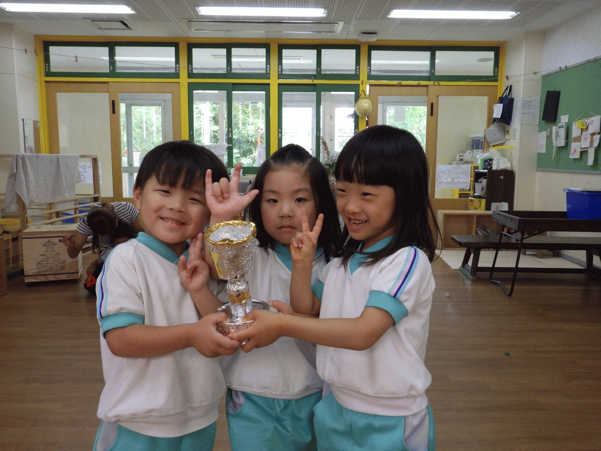 朝から「昨日は楽しかった〜」「カードめくり一位になれなかったね、でもタイヤに乗るやつは一位だったね!」など楽しそうに話す姿がありました。また、カードめくりのトロフィーを代表の子どもにもらってもらい、本番トロフィーを貰いに行っていない子も多くいる為今日はクラスでトロフィーの授賞式を行いました!