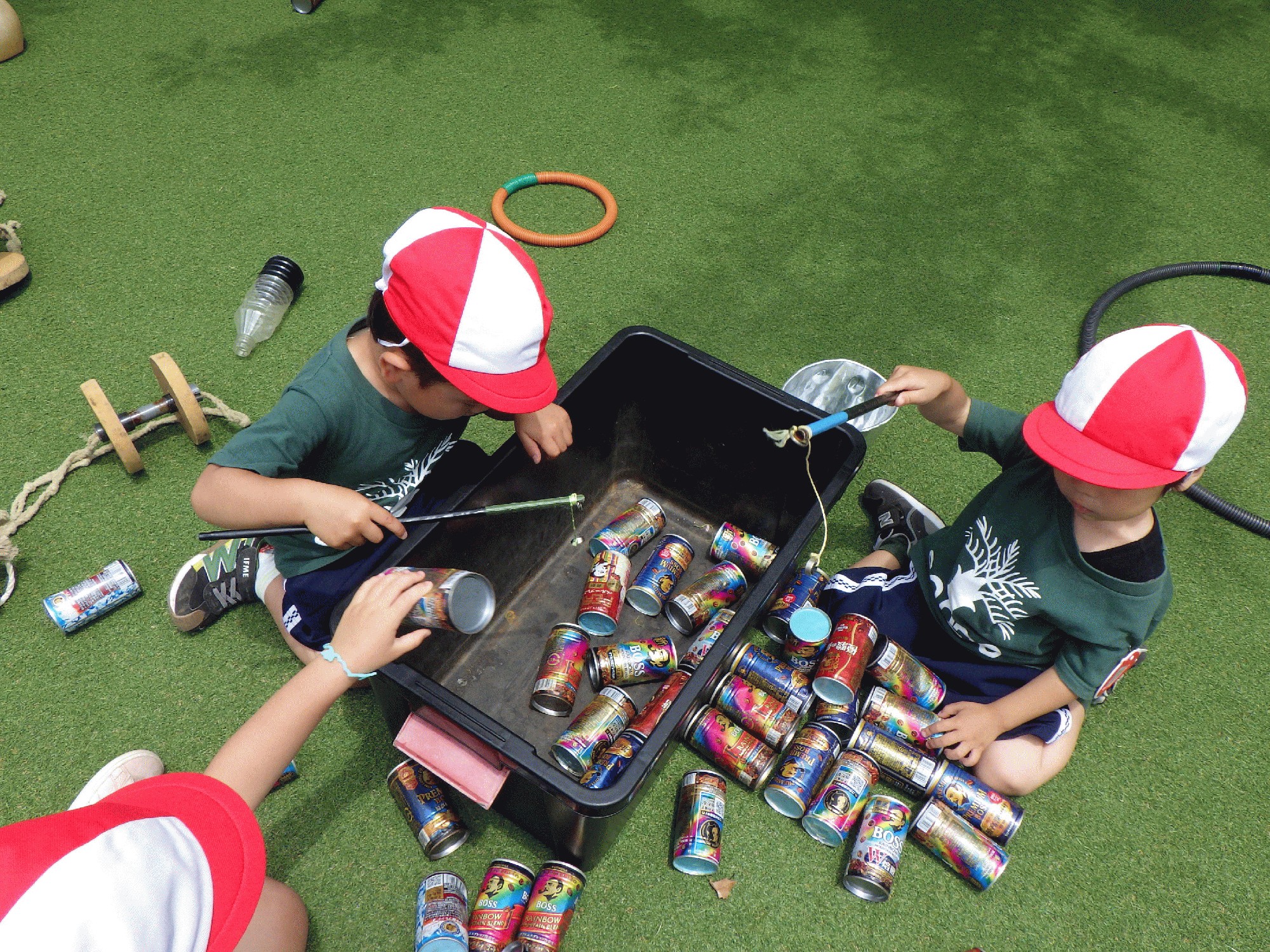 三機工業へ着き池や芝生があり子どもたちは興奮した様子でした。廃材を使ったおもちゃなどあり、空き缶で魚釣りをする子どもたちの姿も見られました🎣「見て!いっぱい取れたよ!」と嬉しそうにお話しする様子がありました。
