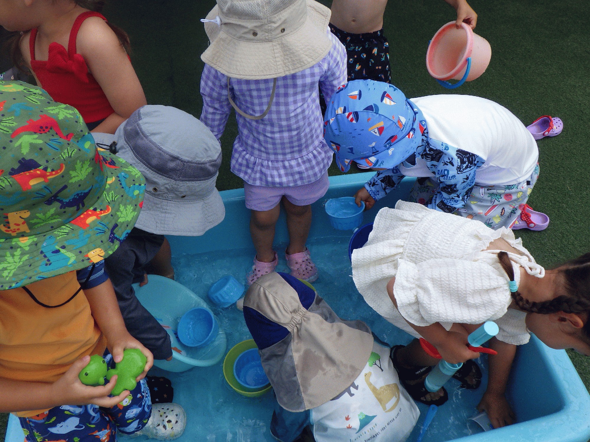 本日は年少初めての水遊びを行いました!初めての水遊びだったので、子どもたちも少し戸惑う様子が見られました。冷たいお水で驚く姿もありましたが、少しずつ慣れてきて体にお水を掛け始め楽しむ姿がありました♡初めての水遊びという事で、魚釣りや水鉄砲などたくさんのおもちゃを用意しました。ごっこ遊びを始める姿もあり「水モンブランだよ!」とモンブランのジュースを渡してくれました🎶ピンク色の容器にお水を入れ「いちごジュースだよ!」とたくさんの飲み物を持ってきてくれました🥤