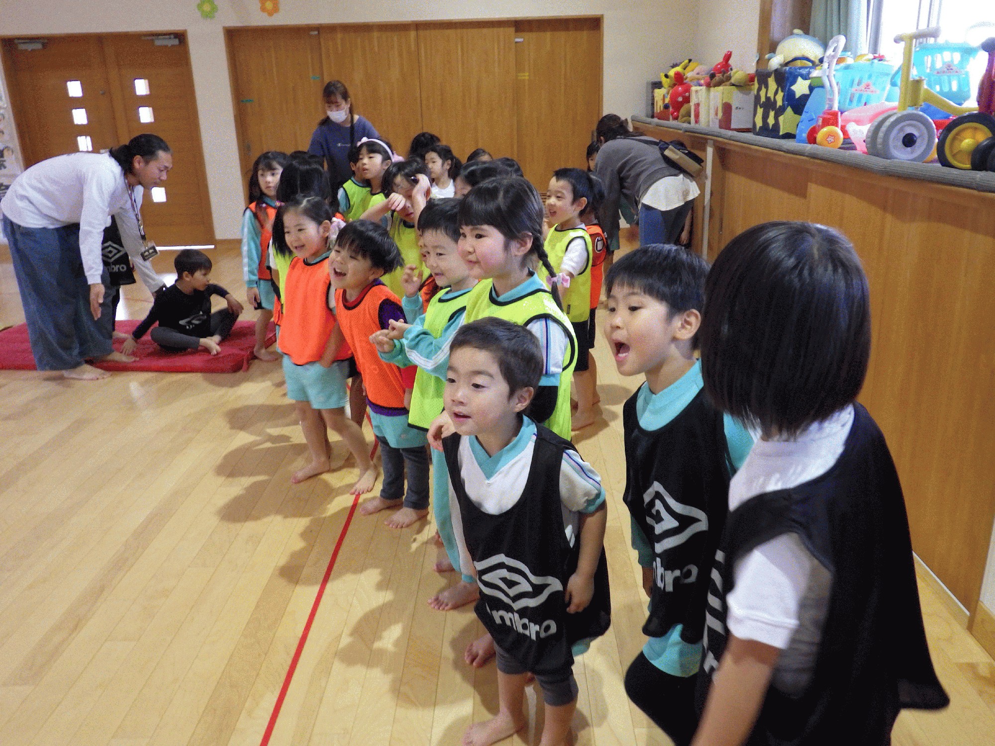 ゲームも多様じゃんけんや、爆弾ゲーム、忍者ゲームなど様々なゲームを行い、子どもたちもすごく楽しかった様で笑顔が絶えない時間となりました!運動遊びが終わり幼稚園に帰ろうとすると、今日友達になった木の子保育園の子どもを探して「またね!」と言って手を振って帰る姿もありました!