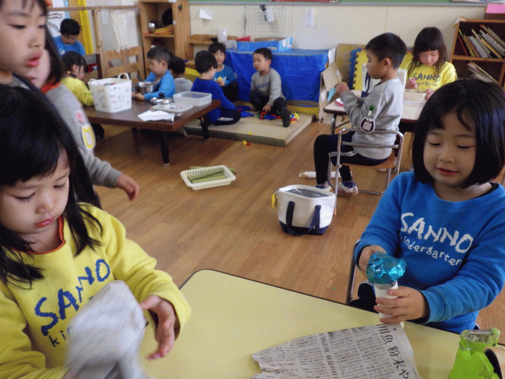 今回はあじさい組が司会進行役になりました。前回担当した時は、幼稚園の楽器を使用して歌をうたいお祝いしましたが、今回は自分たちで楽器を作りたいと意見が出たので、準備することに!司会のマイクも自分たちで作成し、なんだか素敵なお誕生日会になりそうです✨