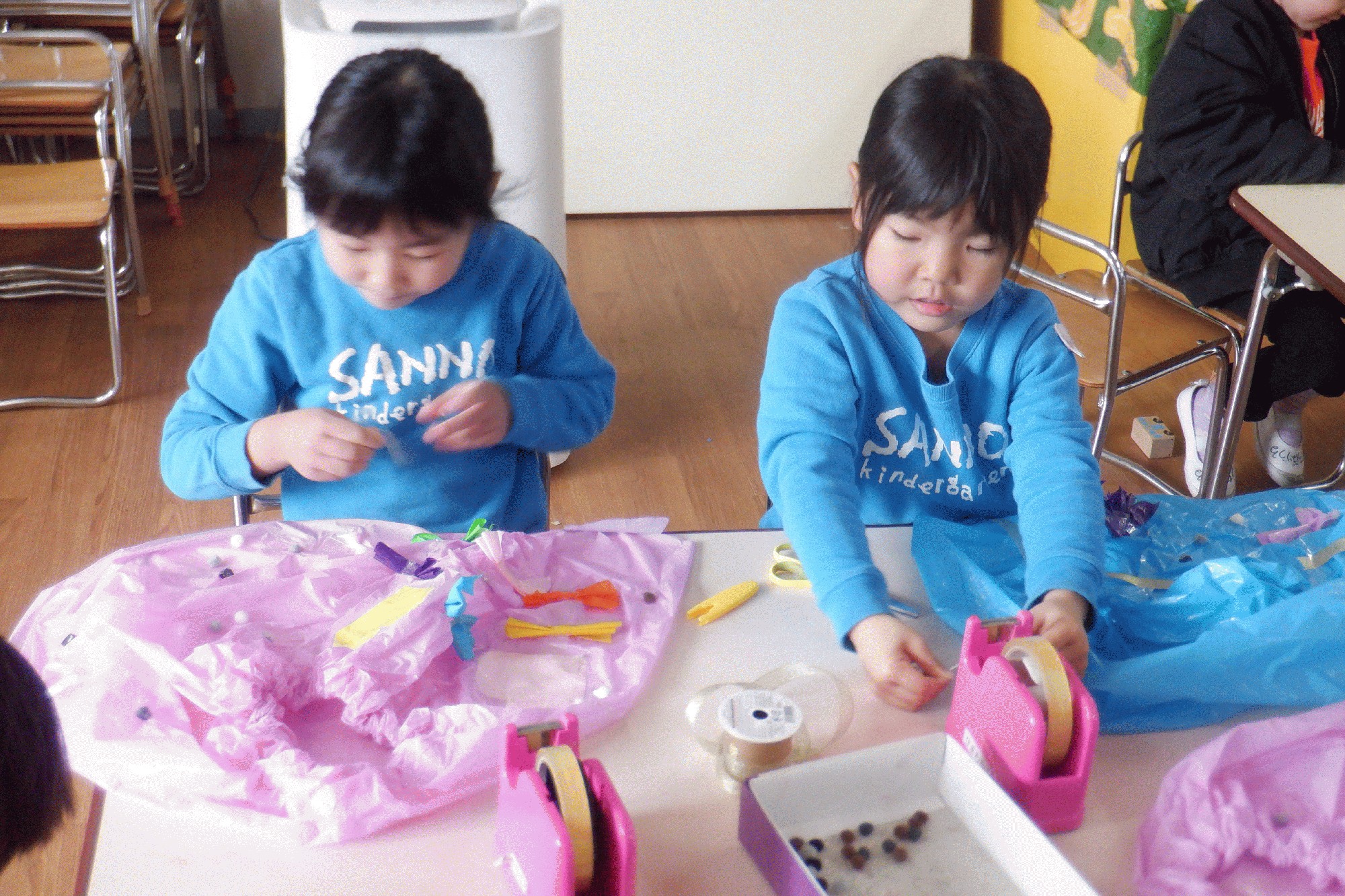 部屋に戻ってから発表会の衣装に飾りを追加しまた素敵な衣装を作っていました。まだまだ続いている劇遊び発展していくのが楽しみです。