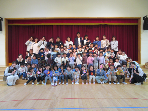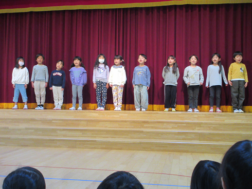 今日は、きりん組さんとのお別れ会をホールで開催しました。入場してきたかっこいいきりんさんが、「ずっと一緒」の歌を歌ってくれ、学校へ行って頑張りたい事や保育園で何が一番楽しかったかなどを一人ひとり発表してくれました。そして乳児組とは玉入れやしっぽ取りのミニゲームを楽しみ、幼児組とはドッジボールを楽しみ皆あせをかく程夢中でした。給食も全園児できりんさんと一緒に食べて楽しい思い出になりました。午後は卒園式で見るスライドショーを皆で見るお楽しみもありました。