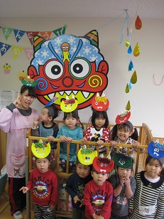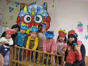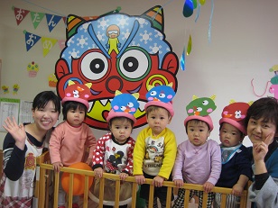今朝早く、木の子に赤鬼と緑鬼が遊びにきてくれました!乳児組はテラスで楽しそうに遊んでいる鬼を窓からみたり、大きなおにのお面に向かってボールで豆まき写真撮影しました。