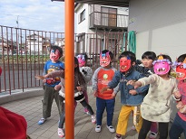 幼児のみんなは、鬼さんが来たら、「鬼はそと〜」と豆まきしてお友だちになろうと言っていたので、ちょっぴり怖かったお友達も鬼さんたちと最後は握手してお友だち記念撮影をしました!皆それぞれ上手に作ったお面をかぶって豆まきして今年の邪気払いをしました。鬼さんは忙しく今度は、山王幼稚園に行ってくると園長先生にはなしていたそうです。