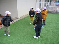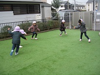 芝を保つために、テラスから芝生へ上履きか裸足で出ることと決まっているため、送迎の際など外側から立ち入ることができませんが、日中 乳児クラスの子どもたちはボールを転がしたり先生とゴロゴロ転がって芝の感触を楽しむ姿が見られますし、幼児クラスは追いかけっこや、設置されている鉄棒を楽しんだりしています。