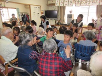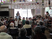 今年もご近所の花物語さんと交流をさせて頂きました。施設の方でも「ようこそ!木の子ほいくえんさん」と大歓迎してくれました。車いすの方が一杯いるからねと話しておいたこともあり、子ども達は何の抵抗もなくおじいさん、おばあさんと触れ合い遊びを笑顔でしてきました。「ふるさと」の歌に涙するかたもいたり、100歳の方も2人いて子ども達もびっくり!