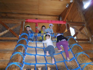 予報通り雨でしたが、瀬谷のまるたのしろログハウスに予約がとれたので行ってきました。くまさんたちは、幼稚園バスに乗れるだけで今回も大興奮!ログハウスでは、階段を登って滑り台で降りたりアミアミを上まで登ったり魚つりをしたりととっても楽しんでくれました。帰ってきてお弁当は、ホールで食べました。ホールもトンネルや橋などを渡ってからブルーシートに行く設定にしてあり、帰ってからもワクワクな子ども達でした。