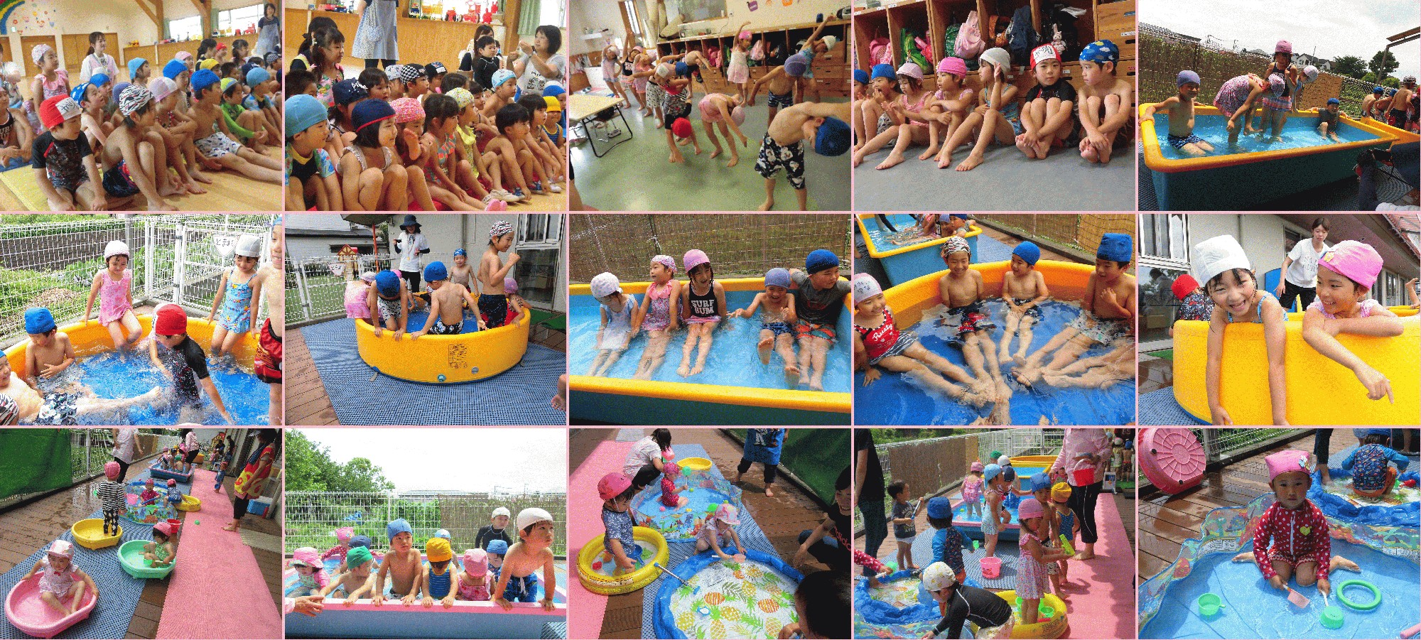台風がとても心配でしたが、晴れて予定通りプール開きができました。前半は、プールでのお約束、監視員のお話などその後は、水着のファッションショーをし、記念撮影!その後は乳児組から順次水遊び開始!蒸し暑かったので気持ちよさそうでした。今年も安全第一で楽しく水遊びをしてまいります!