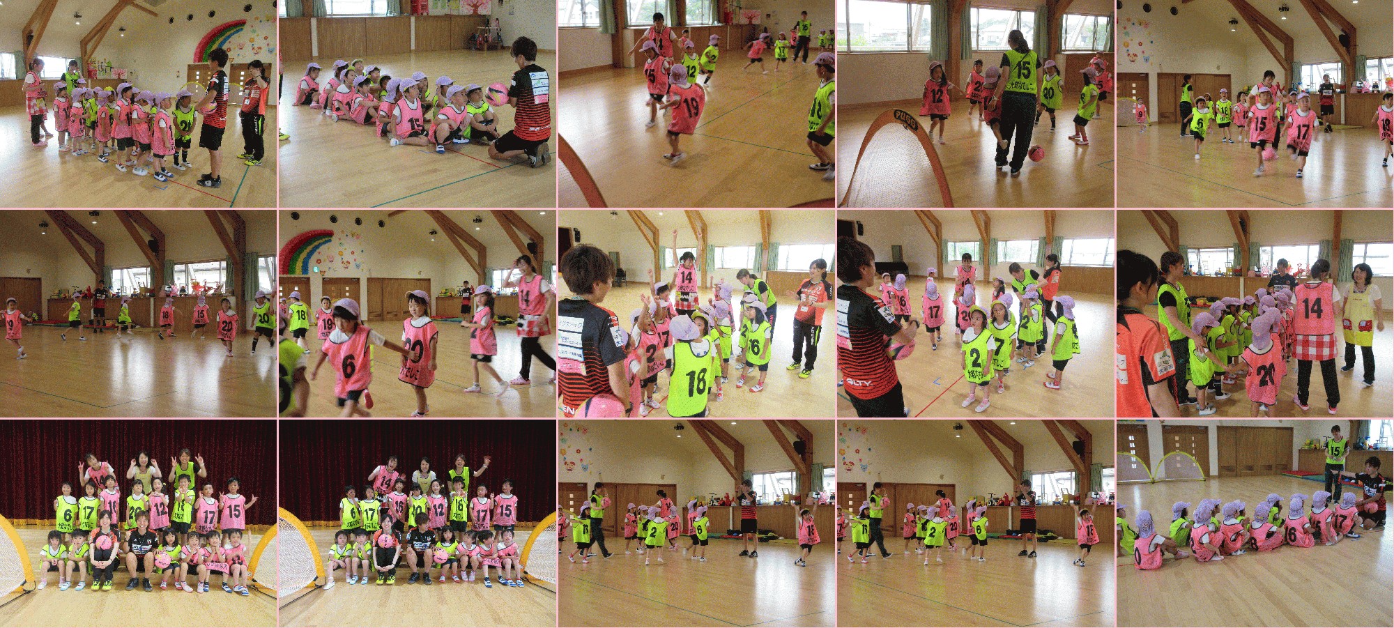 元なでしこジャパン/現大和シルフィードチームである小野寺しほさんと仲間のなつコーチによる体を使いスポーツに親しみ、俊敏性も養うことをねらいとした運動を指導して頂きました。ボールと仲良しになる、ボールをよくみるなど的確な指導の元最後は、黄色とピンクでチーム分けしてサツカーのゲームをやりました。子ども達はいつしか夢中になり一点差での負けに最後は涙の女の子も数人おりました。勝負は厳しい!負けて悔しい思いが大事ですとコーチ。楽しいひとときを有難うございました。